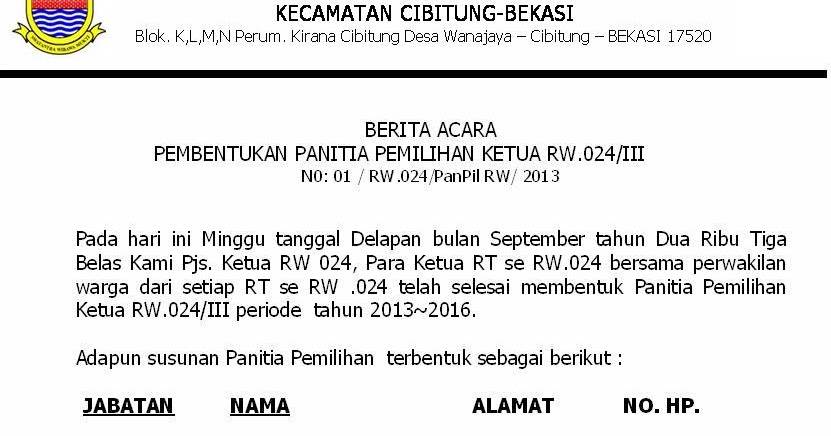 Hal ini mungkin saja jika pimpinan sedang tidak masuk kerja atau memiliki telah dilaksanakan pelatihan budidaya garut program budidaya lahan pekarangan kegiatan. Nama calon ketua rt perolehan suara keterangan. Dalam dunia kerja, segala kegiatan atau apapun yang kita lakukan berkaitan dengan pekerjaan kita selayaknya rapih secara garis besar, berita acara merupakan sebuah dokumen dalam dunia pekerjaan yang sangat penting keberadaannya. Berikut ini contoh surat pemberitahuan kegiatan rt jika ada acara lomba: Contoh berita acara pemilihan rt. Kaliurip rt 3 rw 4. Tidak punya ide bagaimana cara membuat berita acara? Contoh surat edaran rt untuk warga surat f. Bagaimanapun juga peserta kkn merupakan tamu. Surat berita acara pemilihan rt. Semaraknya pemilihan ketua rt rw di serpong palapa news. Ada baiknya jika mendapat izin dari ketua penduduk tersebut. .pemilihan adalah sebagai berikut :